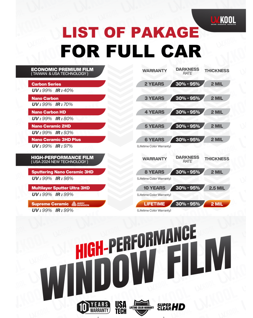 We offers a variety of window tinting solutions for full cars. The products are categorized into two primary types: Economic Premium Film and High-Performance Film, each with different technological features, warranties, and specifications.